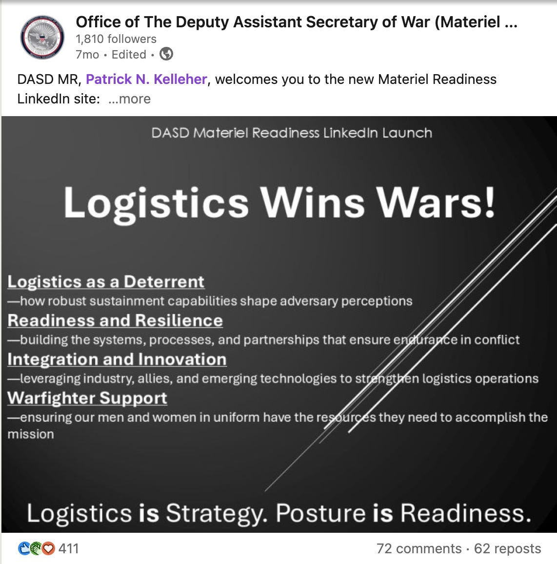 At the assistant secretary and deputy assistant secretary level, the Sustainment and Material Readiness offices seem busy, focused, and hell-bent on attacking contested logistics. I highly recommend following their LinkedIn pages to stay plugged in on events. Although this is not a formal strategy document saying “logistics are important” the informal repetition of priorities, showing up at events, giving industry feedback, distributing solicitations - this is what leadership looks like and this is what accelerates the market to solve problems.