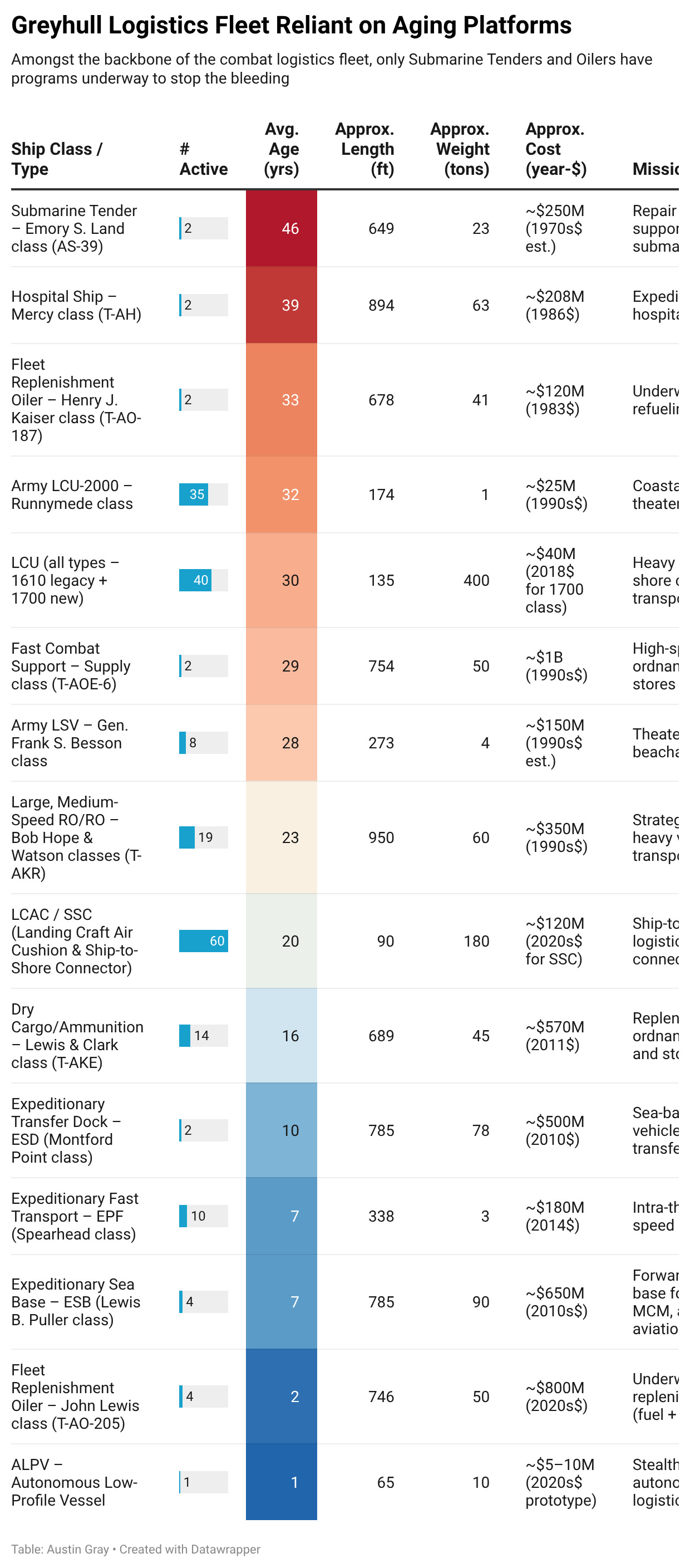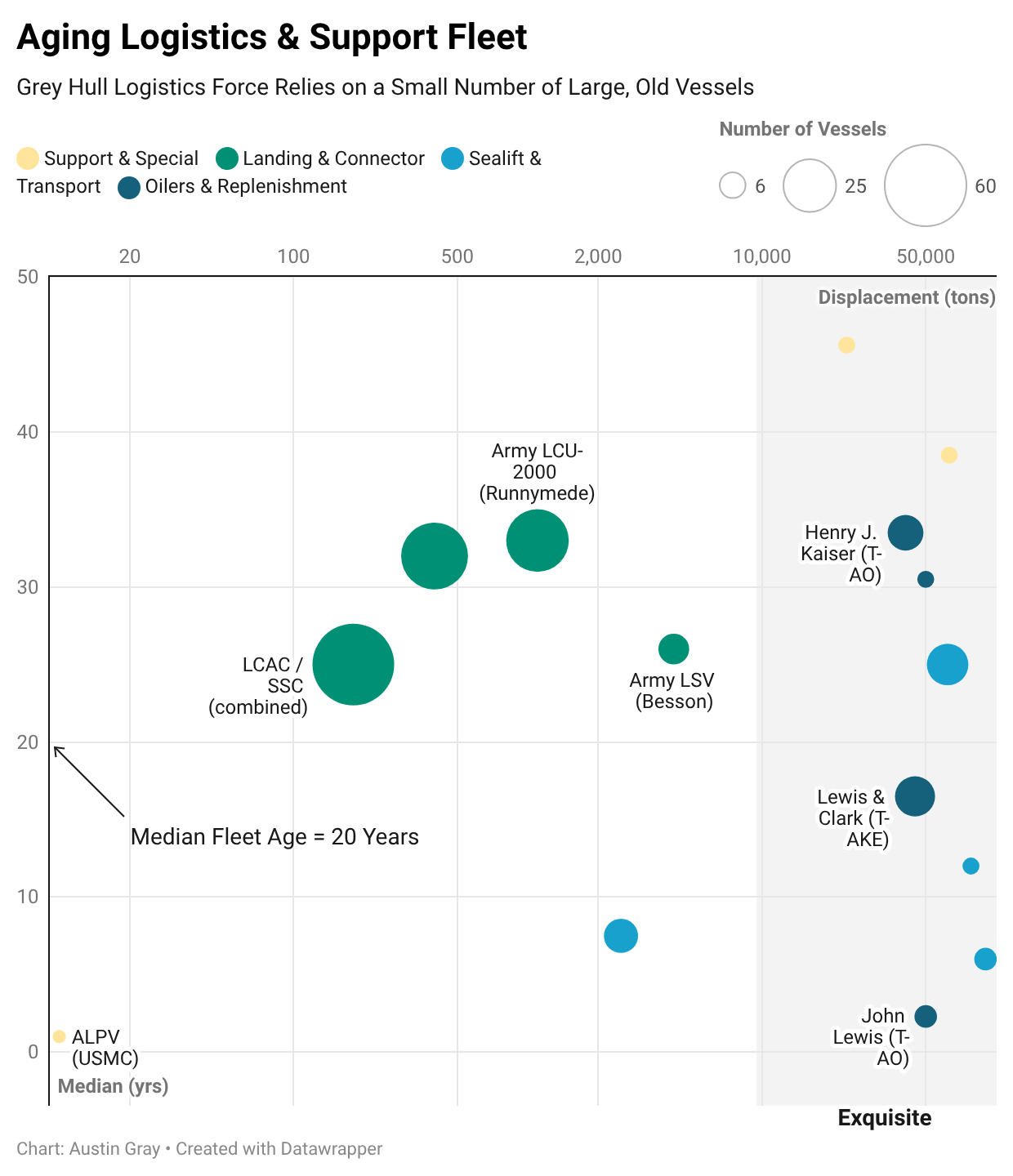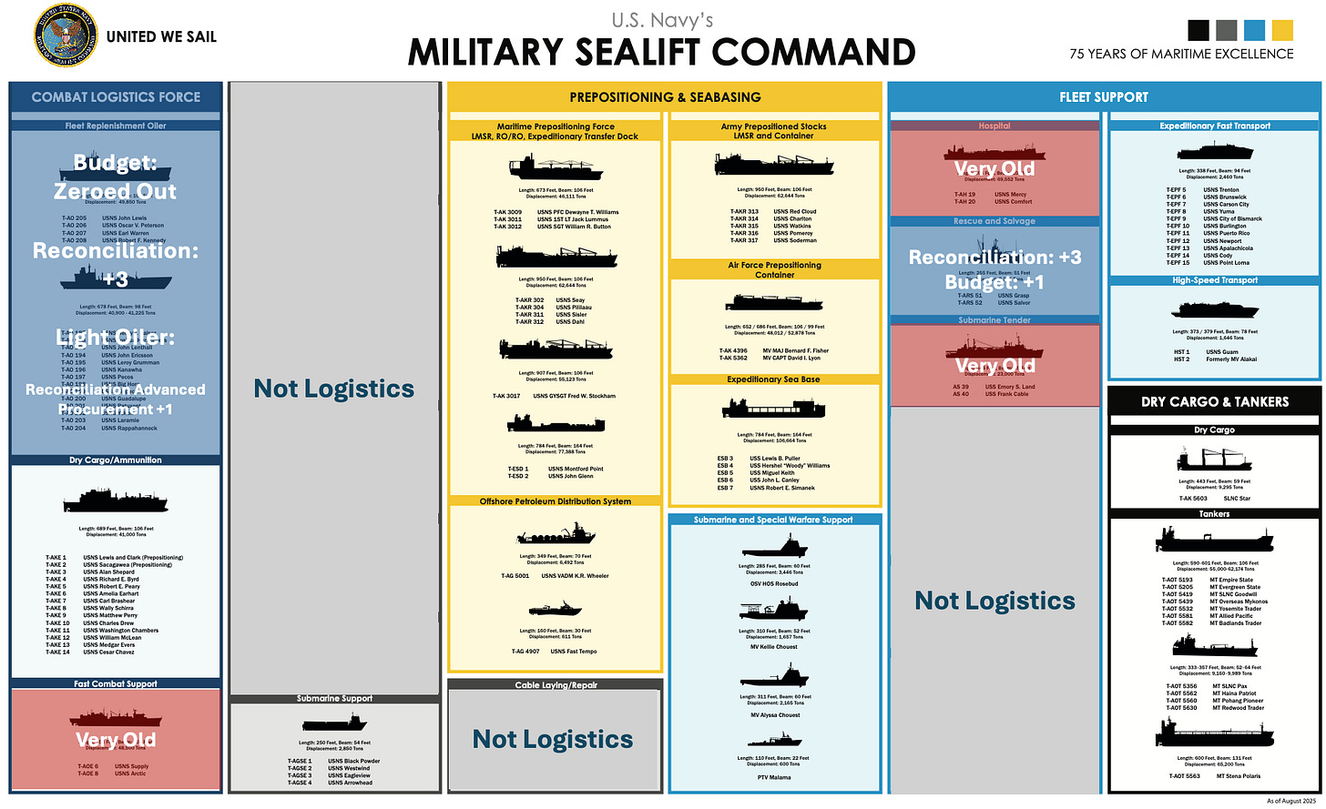 In the below graphic, I’ve broken the fleet - this is a joint fleet view, combining Naval and Army vessels, into four broad mission categories. The vessels in the highlighted area were all built pre-GWOT and likely informed even by Cold War era requirements.
