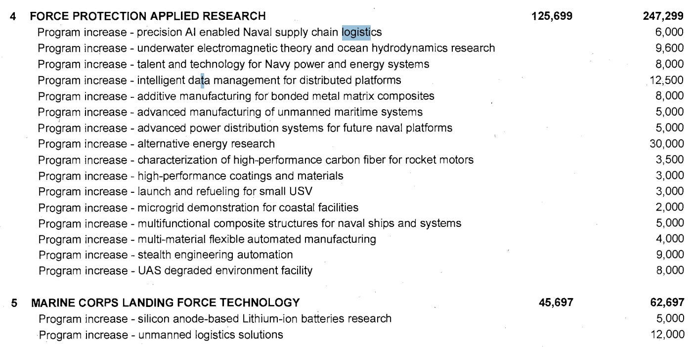 A few lines above jump out showing investment in tech for Navy supply chain, power generation and distribution, logistics data management, UxV refueling, and unmanned landing capability.