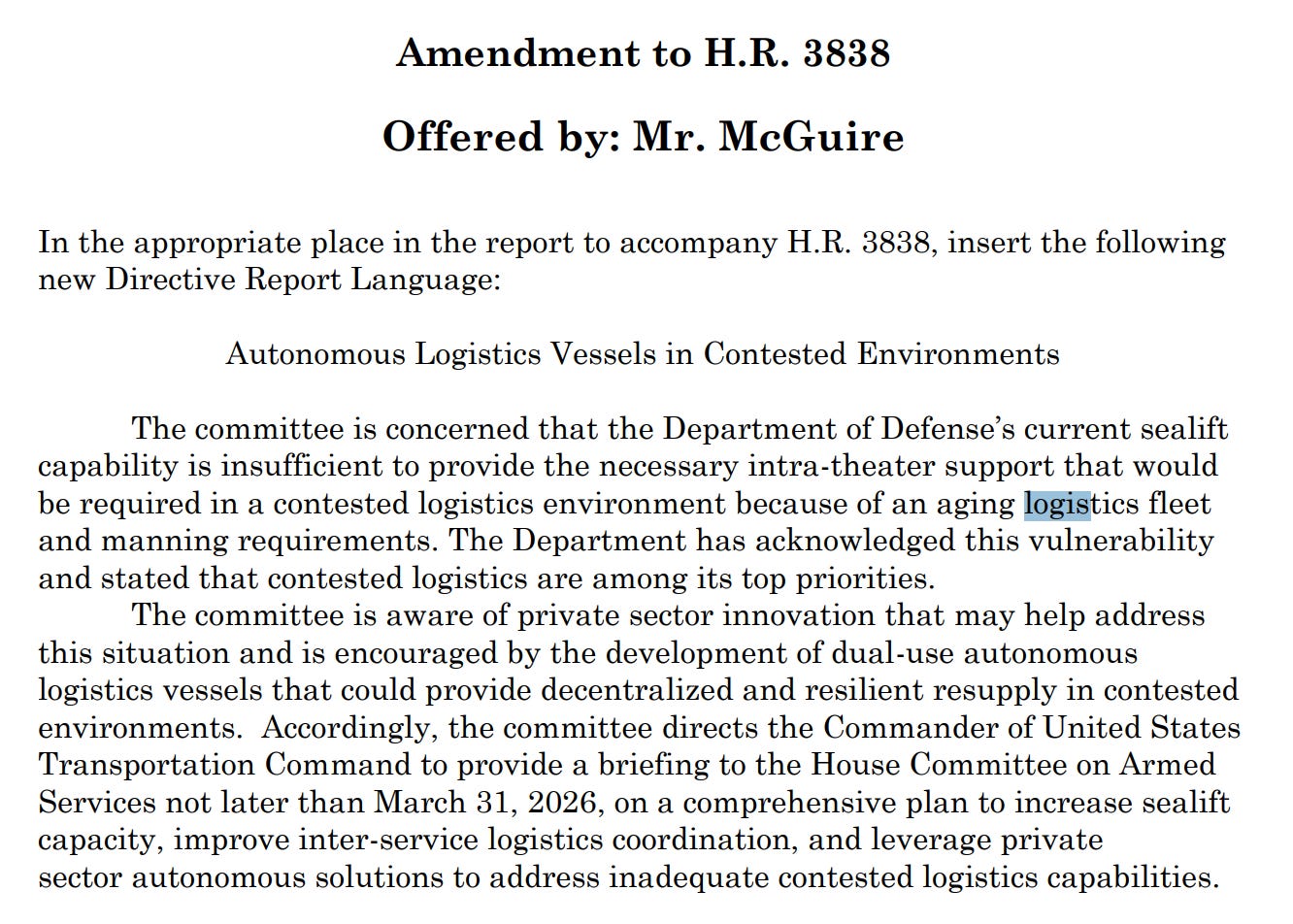 Although there is a lot of talk and potential for unmanned surface vessels - among other attritable platforms - to support the sealift mission, little has yet been done. Congressman McGuire, a Navy Veteran recently elected to represent VA-05, asked the Navy to report back last year.