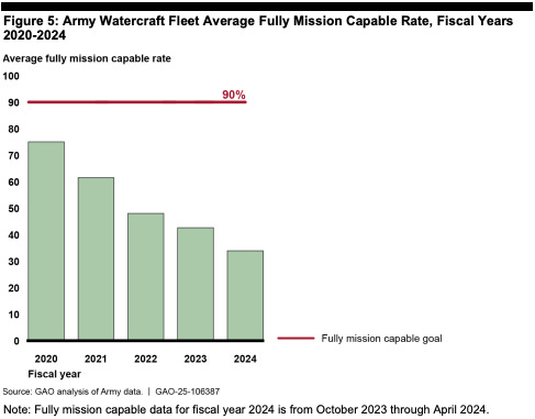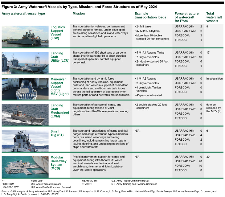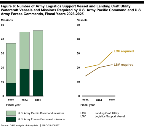The Army also owns and operates a significant fleet of watercraft, which serve as the primary connectors for littoral forces in theater. They’re smaller than the Navy’s, shorter range, and designed to go shore-to-shore and ship-to-shore. GAO’s count in 2024 shows just 64 vessels left in the Army’s fleet, down from 134 in 2018. Of these 64 vessels, 30 are for the infamous Gaza Pier which fell apart quickly in a relatively uncontested environment. The Army’s top-line connector fleet is smaller than it appears - and shrinking.