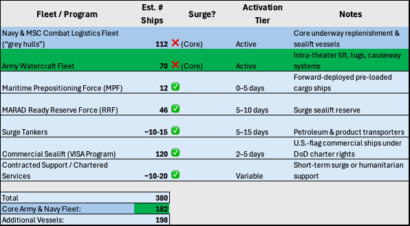 Last, the Navy’s Military Sealift Command (MSC) has the ability to call upon a surge fleet in wartime, which the Department of Transportation and Department of Commerce help sustain in peacetime. This is why we have a Jones Act Fleet. In addition to the joint force’s active 182 Army and Navy vessels, MSC may draw on 12 prepositioning ships, a ready reserve force of 46 sealift ships, an additional reserve of ~10-15 tankers, and a broader selection of U.S. flagged commercial vessels that can be contracted under the VISA program or another commercial charter.