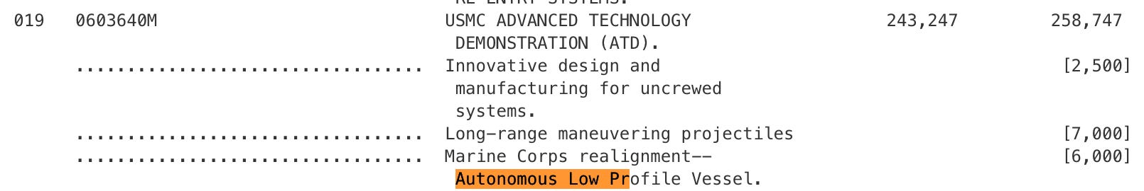 Autonomous Low Profile Vessel (ALPV) - The Marines have been testing their semi-submersible USV in the Western Pacific. I first heard about ALPV back in 2023 and have enjoyed watching it move from MCWL to a Marine Littoral Regiment, a real operational unit in Japan. The screenshot from 2025’s defense budget above shows it had a plus-up (from both houses of Congress) but this budget never got passed since we went to a continuing resolution. Although the Congressional Add was for $6M, this number likely includes a lot of prototyping and testing activity, maybe more than one ALPV. I’ve heard the cost of the platform is much, much cheaper than $6M.