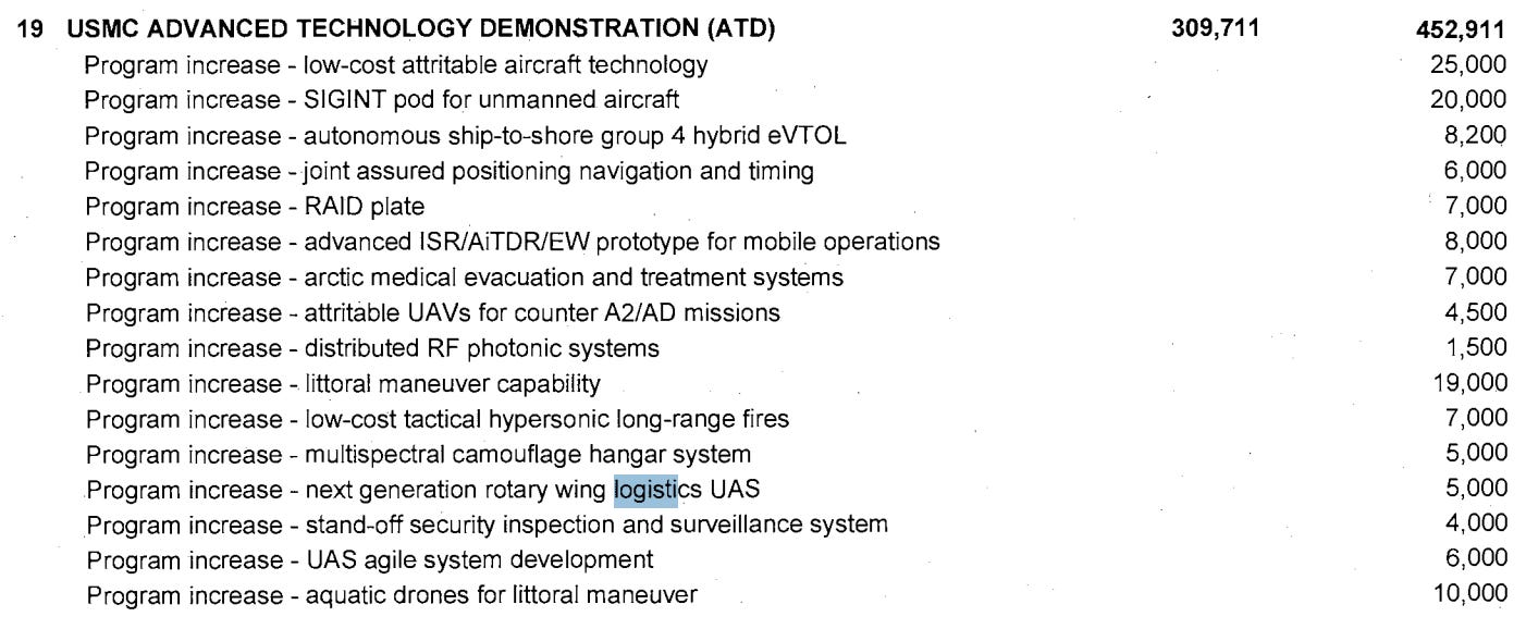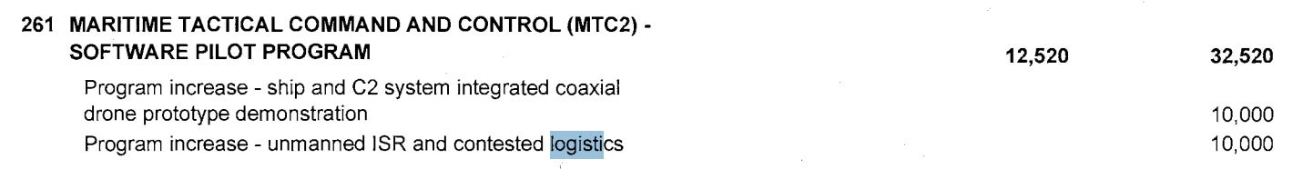 Above, the Marines have a pretty exciting “littoral maneuver capability” funded at $19M - this is a big congressional add. They also have bets on ship-to-shore mobility and aquatic drones, among other contested logistics investments. Note that this budget line “USMC Advanced Technology Demonstration” says nothing about logistics - BUT many of the bets being placed by Congress and the companies lobbying for these lines are bets on attritable logistics solutions. This is true because everyone knows we’re underinvesting, especially the appropriators who run the budget process.