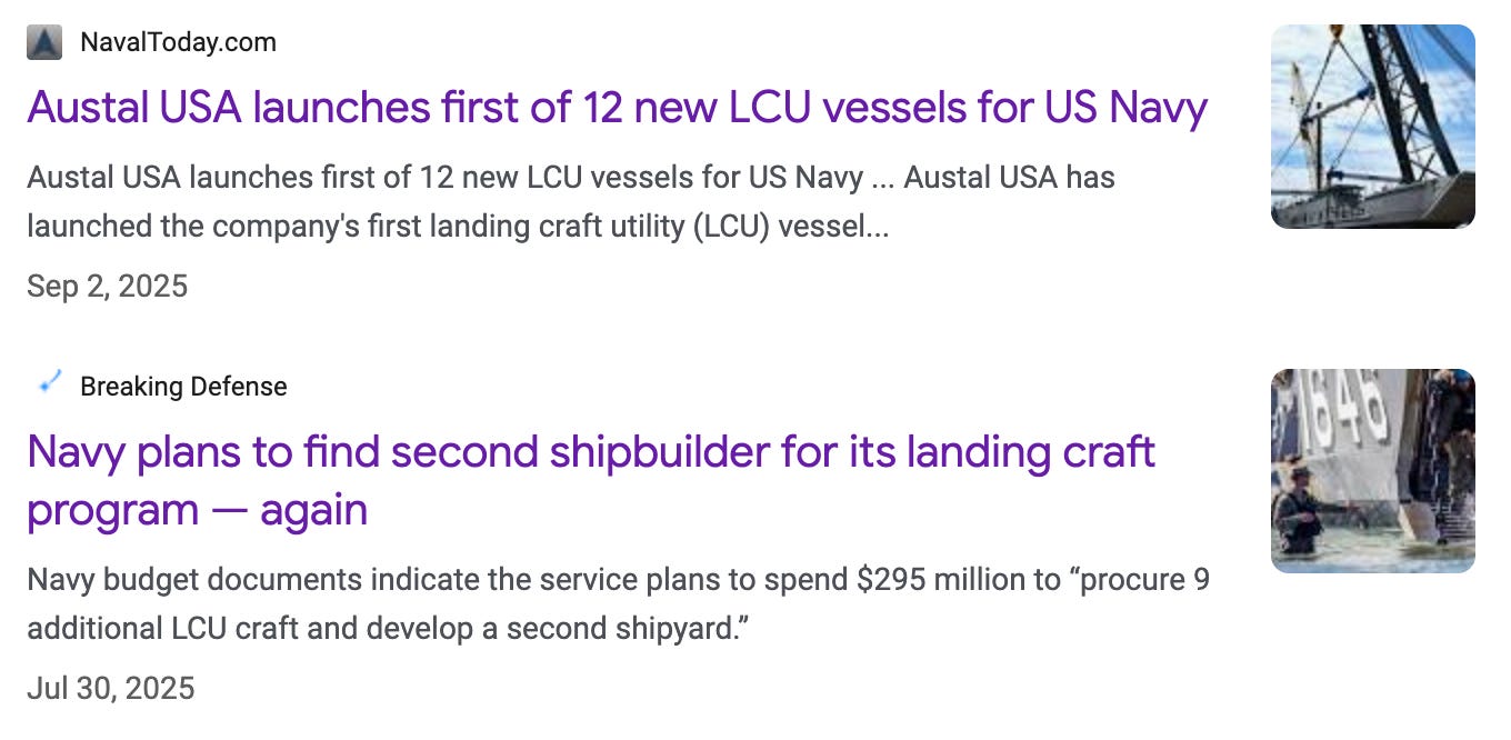 Navy LCUs - This program is getting going, with Austal building and Navy looking for a second shipbuilder.