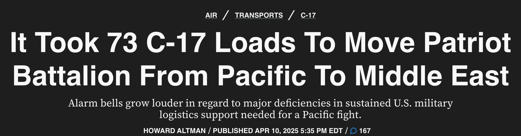 Before we jump in, let’s look at one more headline that exposed massive logistics vulnerability. Moving a single Patriot battery between theaters took 73 C-17 flights, over a third of the Air Force’s fleet. Moving a few trucks, a single air defense unit, took a third of our airlift. This type of operation is not sustainable even in peacetime.