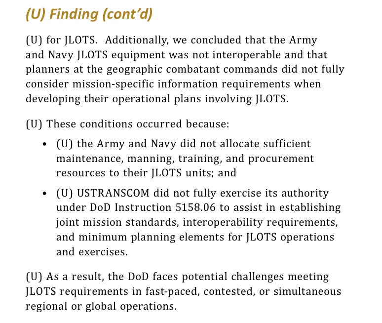 Army-Navy Pier (the causeway, not the football game) - This capability, known as JLOTS, got very unfortunate coverage during the American effort to supply food and material to Gaza at the height of Israel’s invasion. The pier broke apart in standard Eastern Mediterranean chop - the Western Pacific is much worse - and brought national political scrutiny and an investigator general report. The IG concluded that neither the Army nor the Navy had conducted sufficient training or maintenance.