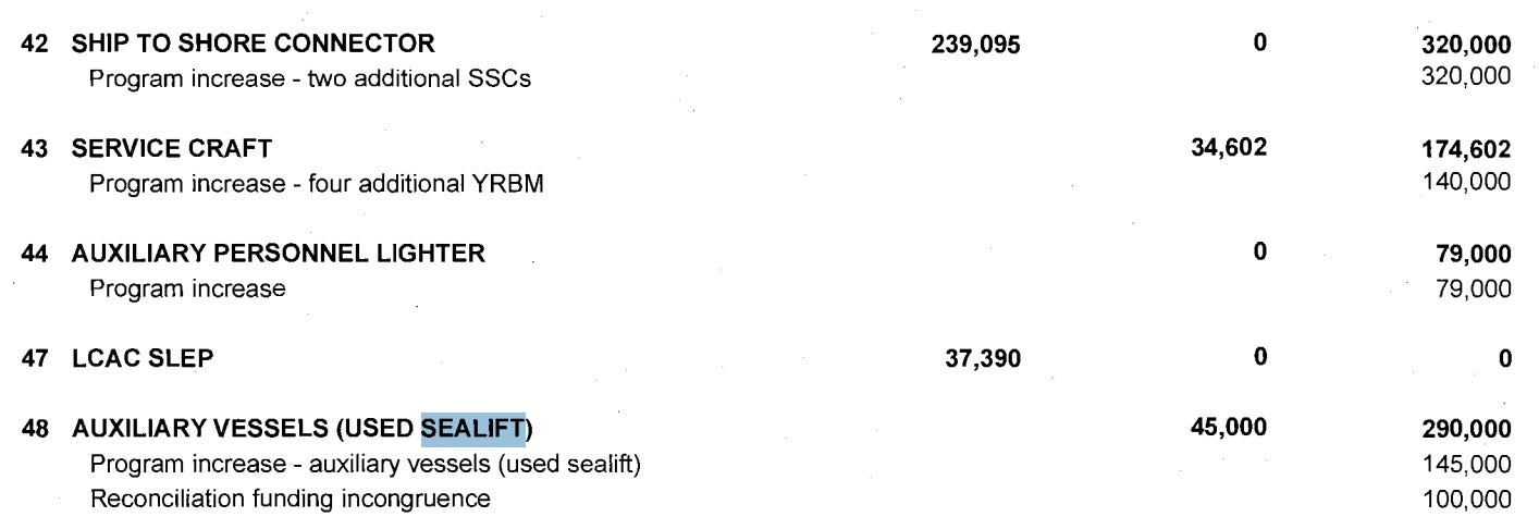 And here are lines boosting a few of the key maritime mobility platforms we’ve been looking at, like SSC. For Medium Landing Ship (LSM) it looks like Congress is adding more vessels, which is on top of the significant investment in LSMs made by reconciliation. More on the LSM program in the next section. Used sealift - not a term I’ve found defined by Military Sealift Command - sounds like a scrappy way to get more sealift vessels quickly, and other language in the Senate JES suggests this $145M will purchase two used vessels for the National Defense Reserve Fleet. I don’t know what the Platform Supply Vessel Pilot program is, but would love to find out. There are also numerous congressional adds for small UAS, USVs, and UUVs - some of these likely conduct logistics missions but it’s not clear from this publicly facing data.