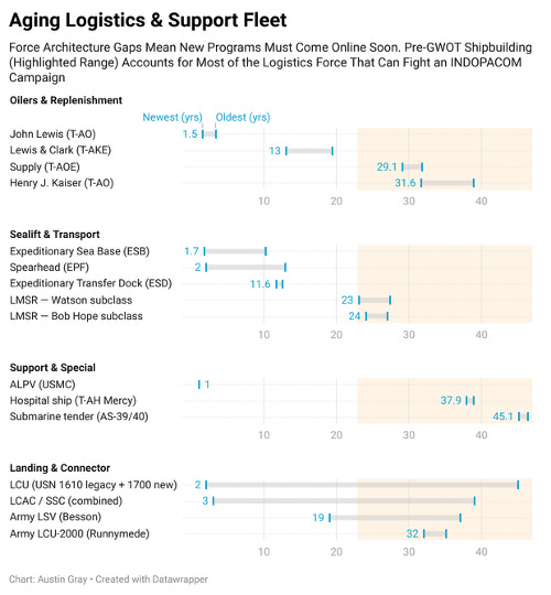 In summary, age creates risk to whole mission categories, often acutely within a program, but the fleet’s shape can also concentrate risk in a small number of large vessels, such as today’s large oilers or vehicle transport ships. These vessels that are by definition the most able to fuel the fleet, are also the fleet’s vulnerability. Each oiler lost could degrade 10-20% of our capacity, in a scenario where ~half the oilers are in play. Some of the Navy’s newest ships - such as EPFs or ESBs - have unclear utility in a contested INDOPACOM fight since they were designed with GWOT requirements.